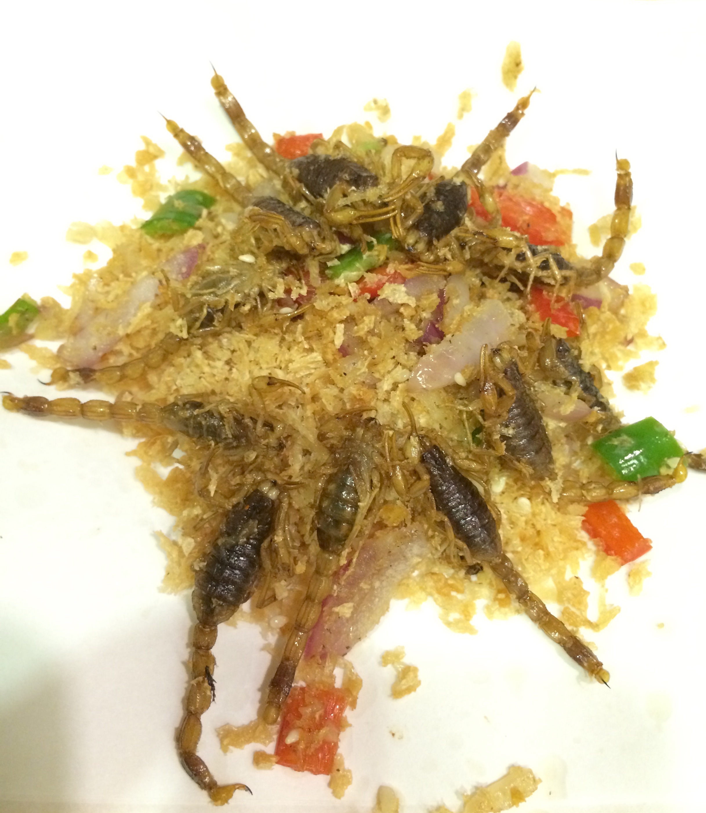 In Guangzhou isst man bekanntlich nahezu alles. Als Delikatesse gelten zum Beispiel Hund, Krokodil, Schildkröten und auch Insekten. Wir haben mal Skorpione und Maden bestellt, diese wurden frittiert und man kann sie echt gut essen. Auch wenn es zunächst abschreckend aussieht, sind diese Insekten wirklich lecker und schmecken ein bisschen wie Chips.