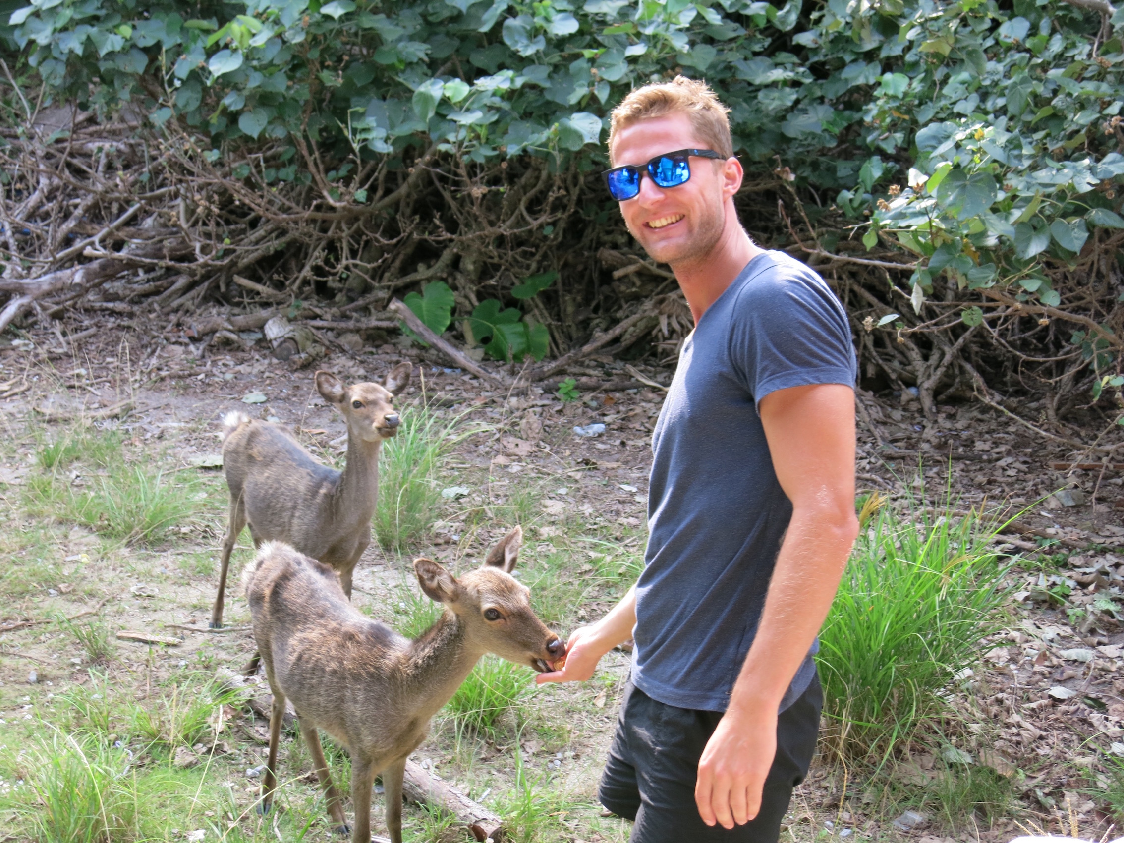 Beim Inselhopping auf Aka Island begegnen mir doch glatt ein Hirsch mit seiner Familie und hinter der Ausleihe für das Tauchequipment kann ich ein paar Rehe füttern. Die leben hier frei auf der Insel und haben sich schon ganzschön an die Menschen gewöhnt. Zusammen mit den bunten Fischen beim Schnorcheln zuvor mein Highlight des Tages!
